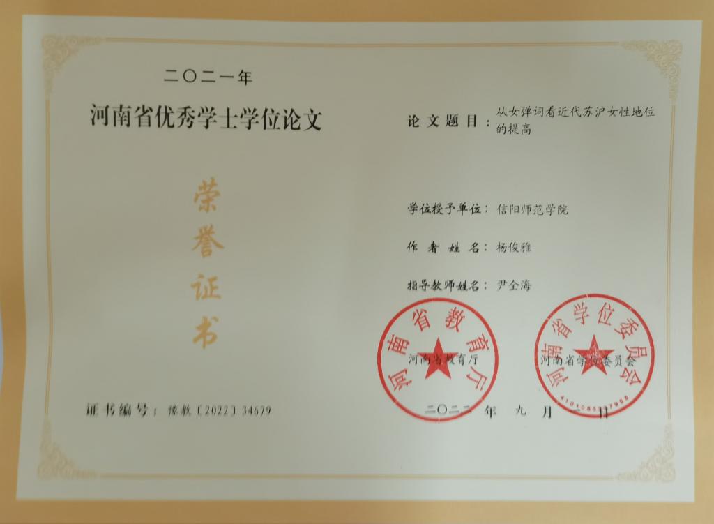 第一篇是历史学专业杨俊雅同学所写的《从女弹词看近代苏沪女性地位的提高》,该论文由尹全海教授指导;第二篇是文化产业管理专业王苏珂同学所写的《农家书屋村民“低”参与的特征及归因分析—基于舞阳县农家书屋的调查》,该论文由李国东博士指导。