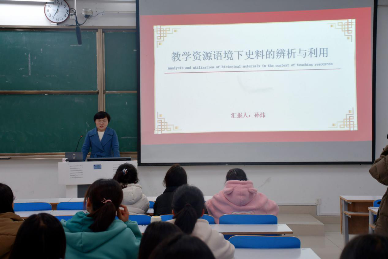 讲座伊始,孙老师提出,在师范生培养中,师范技能的培养非常重要。而师范技能的养成需要充分理解课程改革的要求,加强理论学习。讲座主要从“问题的提出——试题中的史料——教学中的史料辨析——教学中的史料利用”四个方面分析了中学历史教学中史料的辨析与利用。