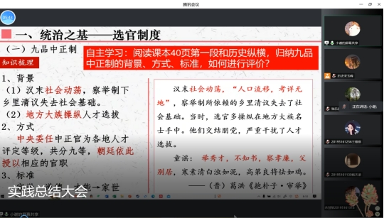本次会议围绕“交流、展示、观摩、学习”等内容展开。首先在展示观摩环节, 2019级优秀实习生代表谢艳宾、王雅祺分别为大家带来题为“隋唐制度的变化与创新”“拜占庭帝国和《查士丁尼法典》”的公开课,杨箪宁同学则设计并展示了一场名为“调整心态,拥抱生活”的心理健康教育主题班会。同学们准备充分,谈吐自然,课堂或班会环节设计合理完整,配合精美的PPT,充分展现了师范生过硬的教师教学技能和良好的课堂把控能力。他们的展示既是教育实践学习心得的集中呈现,也为其他师范生提供了观摩借鉴的机会。