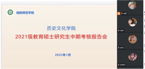 2023年1月7日,beat365以腾讯会议的形式举行了2021级教育硕士研究生中期考核报告会。会议由史经霞主持,叶宗宝、孙炜、李志坚、姚磊、张乐锋、连先用等导师参会,该专业全体在读研究生列会学习。