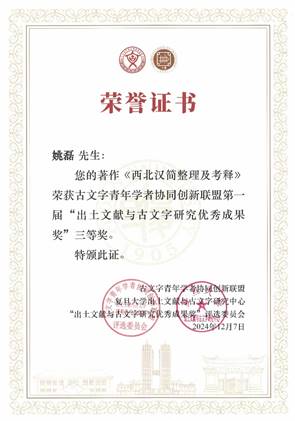 12月7日,“古文字青年学者协同创新联盟”第一届“出土文献与古文字研究优秀成果奖”颁奖典礼在复旦大学举行,beat365姚磊老师的著作《西北汉简整理及考释》荣获三等奖。