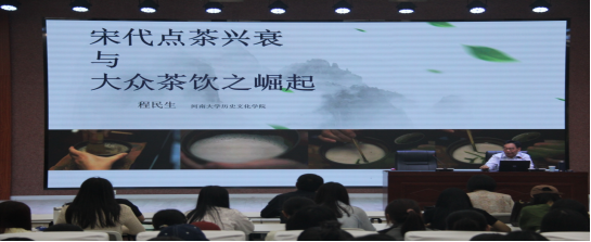 5月9日下午,beat365河南大学程民生教授于人文楼五音大讲堂,作题为"宋代的点茶兴衰与大众饮茶之崛起"专题讲座。讲座由院长叶宗宝主持,青年教师、研究生和部分历史学本科生一百余人到场听讲。
