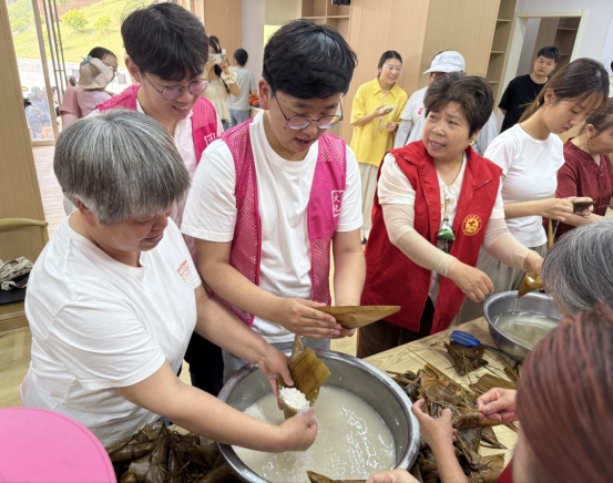 活动伊始,社区居民热情地向学生们传授包粽子的技巧。从粽叶的折叠手法,到馅料的填充比例,再到捆扎的力道把控,居民们毫无保留地分享经验。在居民的耐心指导下,学生们迅速掌握技巧,包粽手法从最初的生疏逐步变得娴熟。翠绿粽叶在翻飞间,裹住糯米、豆沙等食材,一个个造型规整的粽子很快摆满桌面。现场欢声笑语不断、气氛热烈。