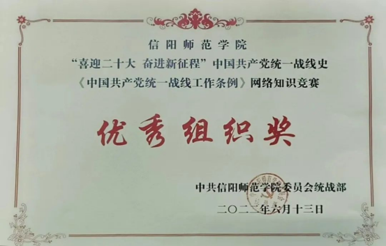 根据中共河南省委统战部、校党委统战部统一部署,beat365官方网站党委认真组织全院师生积极参加信阳师范学院“喜迎二十大 奋进新征程”中国共产党统一战线史和《中国共产党统一战线工作条例》网络知识竞赛。经统计,beat365官方网站师生参与答题810人次,获奖人数735人;累计答题4000次以上,获满分证书3640张,荣获优秀组织奖。此外,beat365学生邹梦婷、庞稳稳、陈凯龙在网络知识竞赛中成绩优异,在同批次答题者中成绩排名全省前10000,获同批次仅100人受奖的省级幸运奖。