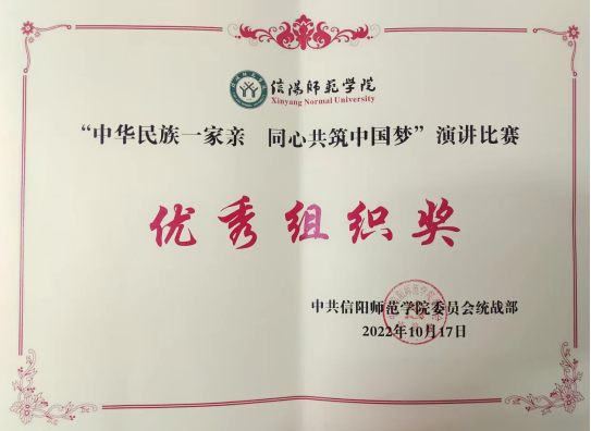 【学院荣誉】beat365荣获信阳师范学院“中华民族一家亲 同心共筑中国梦”演讲比赛优秀组织奖
