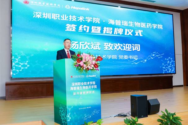 10月26日,深圳首个生物医药特色产业学院——深圳职业技术学院·海普瑞生物医药学院签约揭牌仪式暨海普瑞生物医药学院首届高峰论坛在学校留仙洞校区同德楼1号会议室举行。深圳市人民政府副秘书长、一级巡视员产耀东,深圳市市场监督管理局药品处副处长张天,深圳市科技创新委员会生物科技处副处长王绍文,海普瑞药业集团董事长李锂,副总裁单宇、张洁,深圳技术大学药学院院长贺震旦,深圳市药师协会秘书长陆喜宇,深圳市生命科学与生物技术协会执行秘书长王艳梅,学校党委书记杨欣斌、校长许建领出席。仪式由副校长温希东主持。