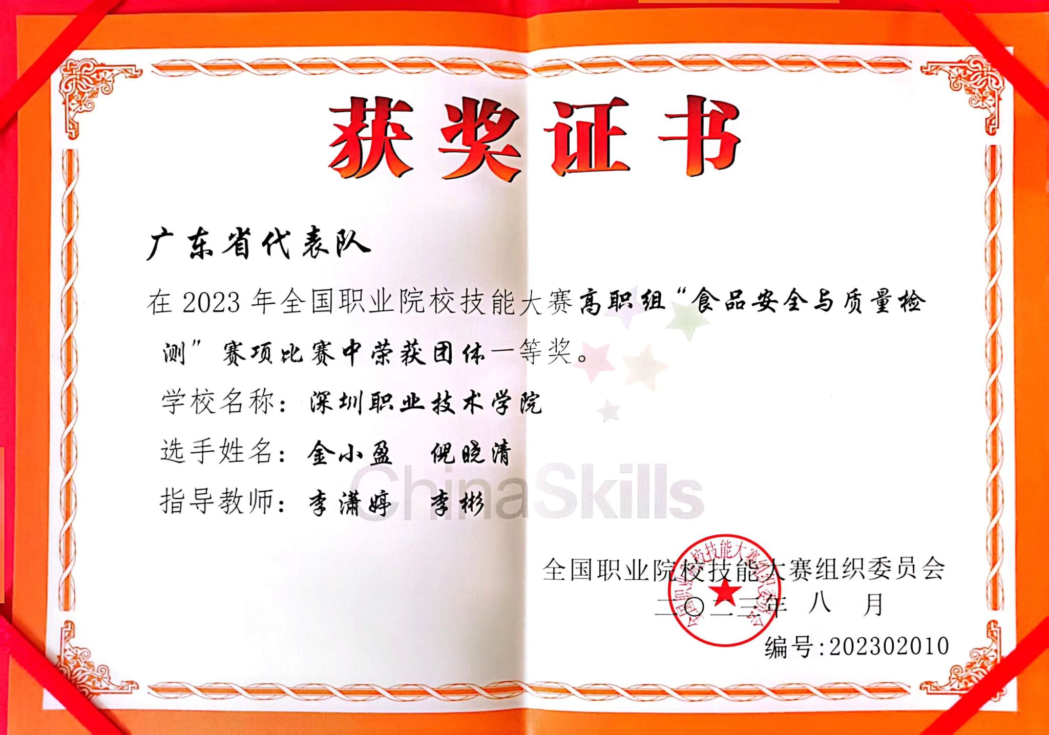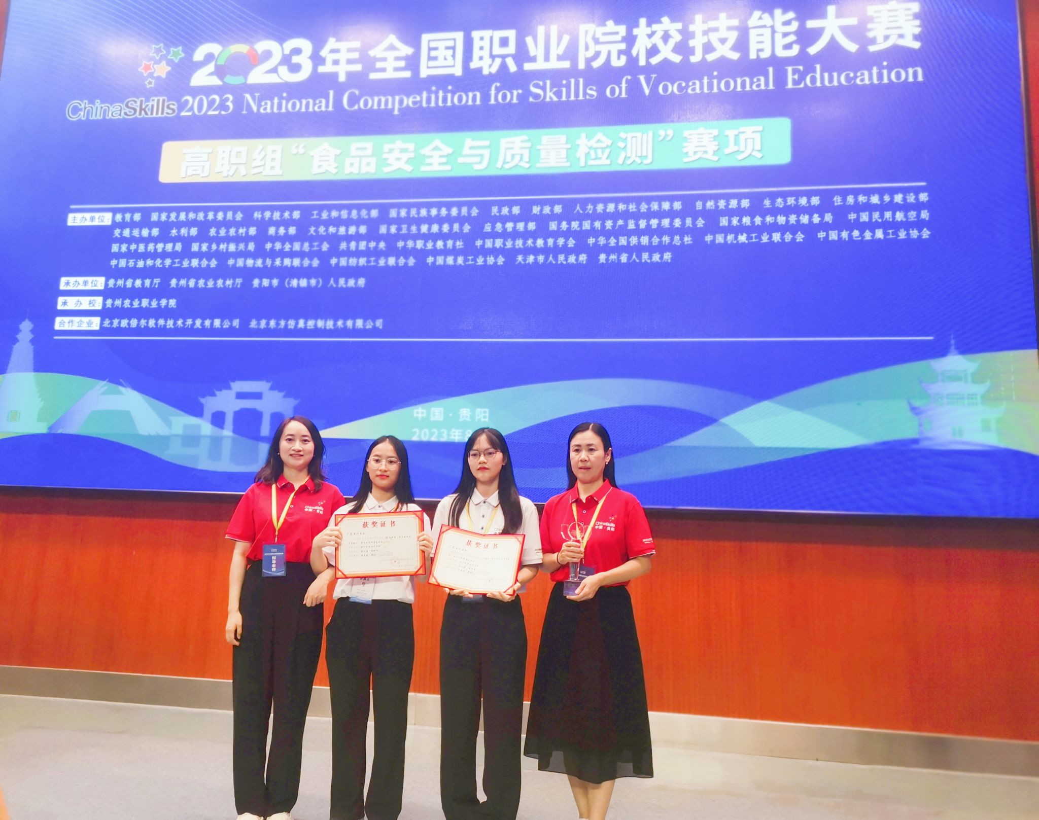 8月16日-20日,2023年全国职业院校技能大赛高职组“食品安全与质量检测”赛项在贵州农业职业学院举行,来自全国31个省(区、市)职业院校的60支队伍同台竞技。经过激励角逐,伟德官网伟德bv国际体育李潇婷、李彬、沈丽老师指导的学生倪晓清和金小盈凭借扎实的专业知识、娴熟的技能,沉着应战,团结协作,一路破关斩将,最终获得赛项团体一等奖。