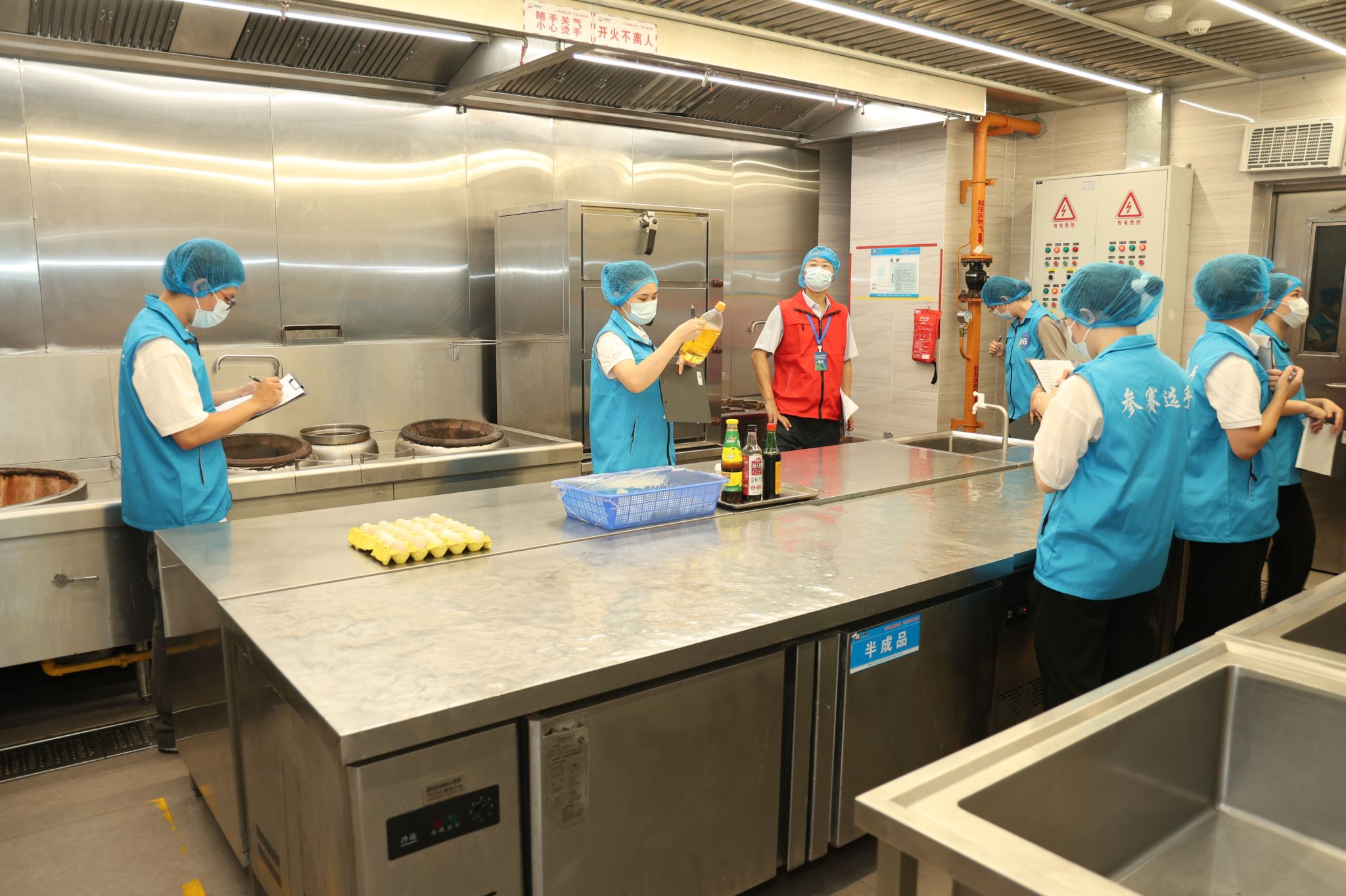模块A比赛方式为选手依据赛题情境要求,进入食堂的洗消间、果蔬粗加工间和烹饪间进行食品安全检查,并将现场查出的食品安全问题对应填入《检查记录表》中;模块B比赛方式为选手根据现场大屏幕显示的食品检验报告、食品标签、车间布局图片快速判断不符合标准的问题,并写出不符合标准的依据。