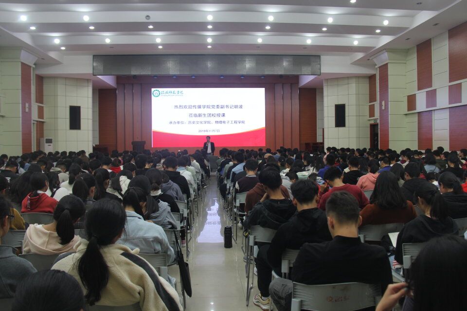 117日晚, 传媒学院党委副书记胡波应邀在逸夫楼报告厅举为beat3652019级新生团校做了题为《大学路途》的专题辅导讲座,本次团课由beat365党委副书记刘喜元主持。beat365团委书记王道歆、新生辅导员付亚男也参加了此次团课。