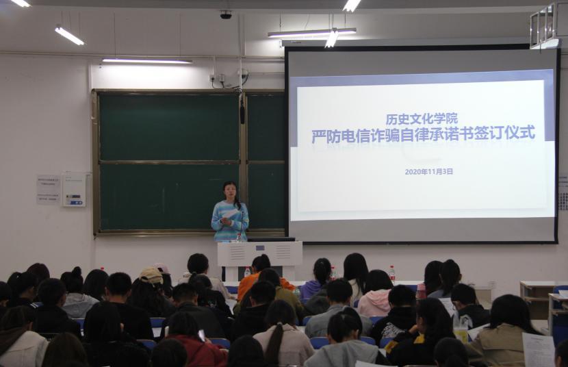 11月3日,beat365团委老师付亚男在社科楼212教室主持进行严防诈骗安全意识教育和自律承诺书签订仪式,beat365全体2020级新生参加。