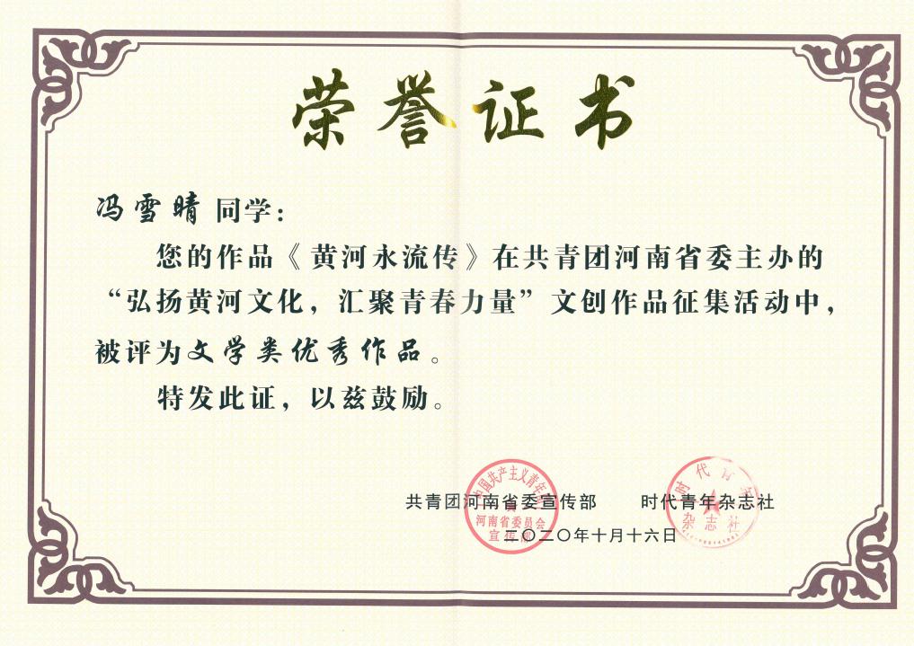 近日,由共青团河南省委主办,由共青团河南省委宣传部、时代青年杂志社、河南省青少年全媒体中心承办的“弘扬黄河文化,汇聚青春力量”文艺作品征集活动落下帷幕。beat3652019级历史学2班学生冯雪晴作品《黄河永流传》被评为文学类优秀作品。