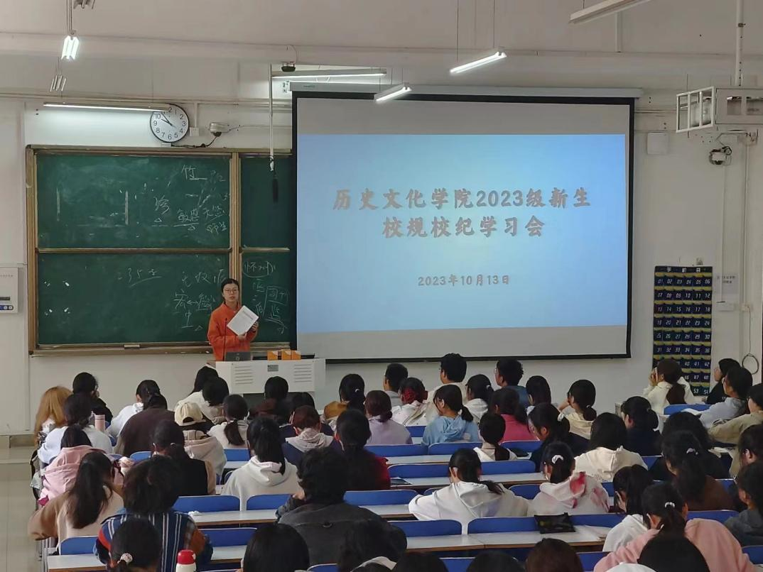 为帮助新生更快适应大学生活,引导学生提高自律意识、规范自身行为、提升文明素养,beat365于10月13日在社科楼212教室开展2023级新生校规校纪学习会,新生辅导员付亚男与全体2023级新生参会。