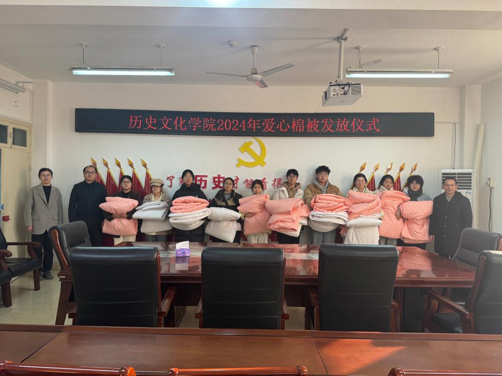 仪式开始前,何永亲切询问了同学们的生活学习情况,并介绍爱心棉被发放活动已持续开展20年,成为学校关爱学生的一项传统暖心举措。叶宗宝勉励大家珍惜良好学习环境,扎实学好专业知识,厚植爱国情怀,回报社会和国家。随后,两位领导将棉被一一递到受助学生手中。