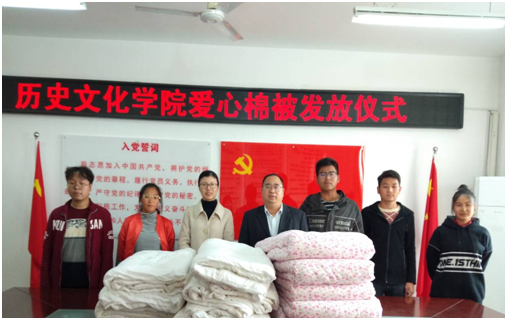 近期气温骤降,为帮助家庭经济困难学生温暖过冬,11月13日,beat365于人文楼党员之家举行了2019年寒冬送温暖棉被发放仪式。beat365党委副书记刘喜元,新生辅导员付亚男与困难学生代表一同参加仪式。