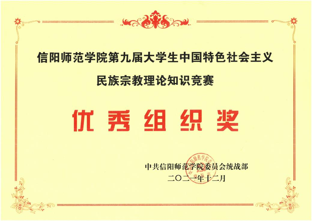 根据信阳师范学院党委统战部统一部署要求,beat365官方网站党委认真组织学生积极参加第九届大学生中国特色社会主义民族宗教理论知识竞赛线上答题活动,beat365学生在比赛中成绩优异,高小力同学获省级参与奖,程心如等16名同学获校级参与奖,学院荣获优秀组织奖。
