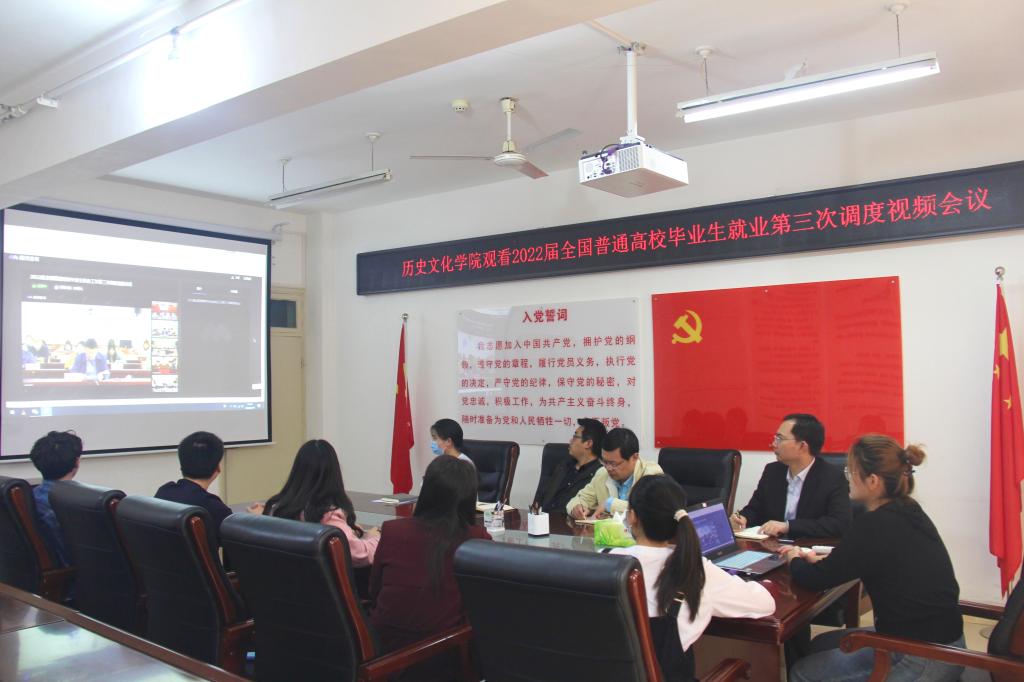 4月19日下午,教育部召开2022届全国普通高校毕业生就业工作第三次调度视频会议,教育部学生司副司长吴爱华、全国就业指导中心副主任宁小华出席会议并讲话。beat365官方网站在人文楼805会议室组织师生代表收看,学院党委书记李辉、党委副书记韩志宏、副院长李志坚及毕业班班主任、就业创业课任课教师等师生代表共同收看。