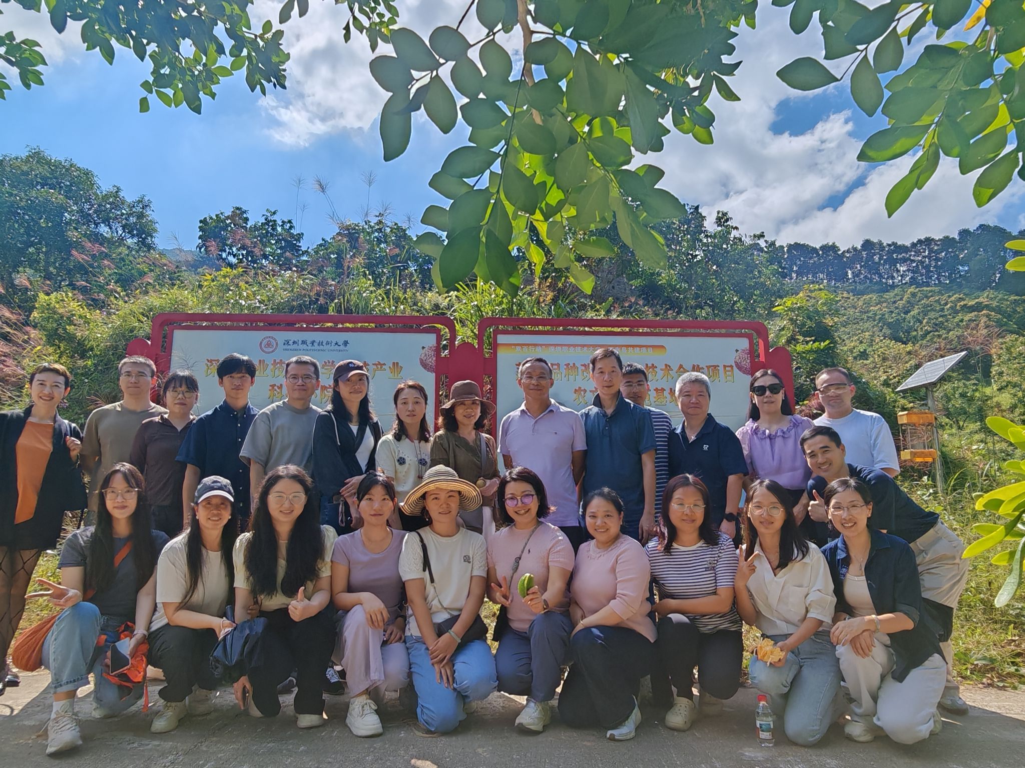 8日上午,队伍驱车前往九龙峰荔枝科技小院。现场聆听驻点教师彭刚作《双百荔枝项目2025阶段性成果》专题汇报。团队围绕“迟美人”等新品种已建成两个50亩示范园,高接换种与绿色防控同步推进;30个优质采穗品种全部成活,为县域品种换代提供母本保障。科技小院把课堂搬进果园,累计培训769人次,培养出10名“荔枝嫁接匠人”,并帮永和村争取到500万元乡村振兴资金。更令人惊喜的是,依托深职大平台,冻干荔枝、荔枝费南雪等四款深加工产品已完成小试,农户亩均增收1800元,一颗荔枝从“大小年”烦恼到“全年鲜”突围,科技赋能让老果树长出新经济。