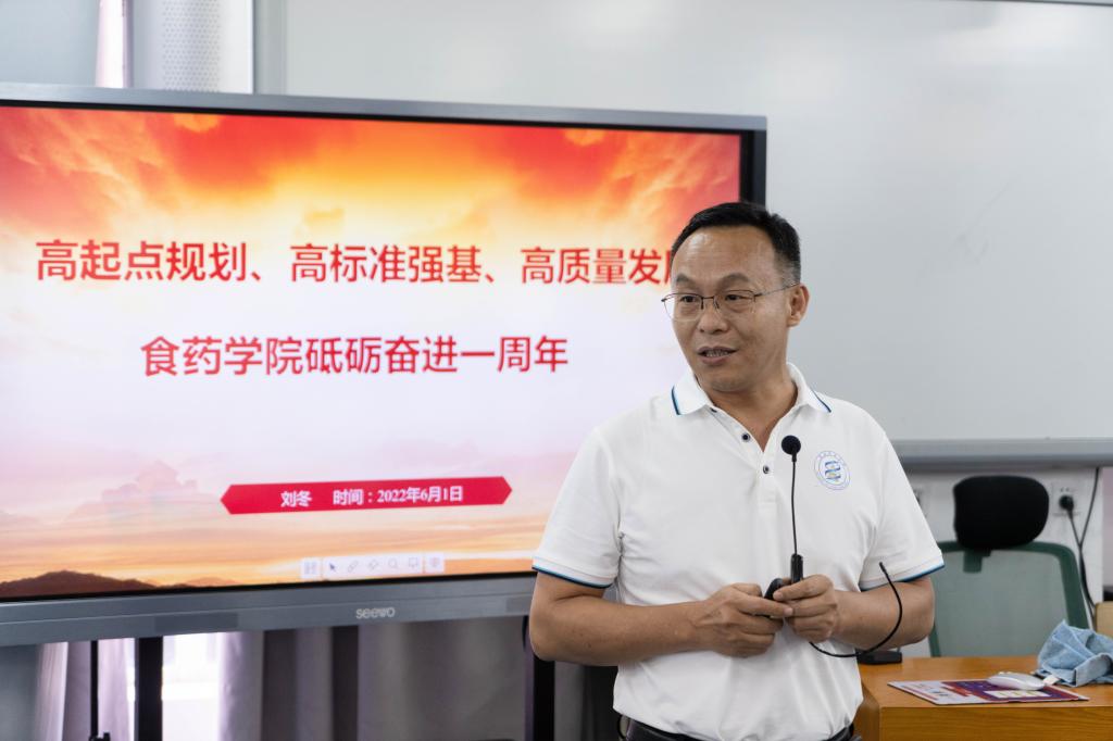 刘冬代表学院做了题为《高起点规划、高标准强基、高质量发展——伟德bv国际体育砥砺奋进一周年》主题报告。刘冬在讲话中指出,伟德bv国际体育的成立,承载了学校的战略期望。自2021年5月25日学院成立以来,在学校党委坚强领导下,伟德bv国际体育全体教师勇挑重担、爬山涉水,迎难而上,传承创新,凝心聚力、开启新篇,铸就学院充满生机的初生之年,全院有序推动海普瑞生物医药学院、生物医药研究院、生物医药生产性实训基地、生物与医药高水平学科点培育等重大项目落地,高起点规划学院专业设置,努力将北校区新实训楼建成设备一流、技术领先的世界一流智慧实训室,学生在第七届中国国际互联网+创新创业大赛、第十三届“挑战杯”广东大学生创业计划竞赛、广东省职业院校学生专业技能大赛等赛事中斩金夺银、捷报频传,黄略略获校长教学质量奖,杨剑教授团队获得2021年高等职业教育教学成果奖特等奖,新增省级海洋药物产教融合创新平台1个、食品安全与质量控制创新团队1个,在党建引领、专业规划、产教融合、人才培养、书院建设、科研与社会服务、高层次人才引进等方面取得明显成效,成果丰硕,学院干事创业的良好氛围正在形成,只争朝夕的精神特质逐渐凸显。刘冬说,学院庆祝活动适逢六一儿童节,他号召全体老师保持童心,撸起袖子加油干,解放思想大胆干,开拓创新用心干,攻坚克难奋力干,上下同欲齐心干,在食药学院创新发展、协调发展、共享发展的高质量发展大道上,展现新气象、新作为,一起向未来,以更加优异的成绩献礼党的二十大!
