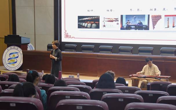 赵爽回顾了前两期的讲座内容,从三合之音展开新授,介绍了古琴的发展与创新。她谈到古琴有泛音、散音和按音三种音色,泛音法天,散音法地,按音法人,分别象征天、地、人之和合;并以典故诗词为例,向大家讲解宫商角徵羽五音调式。宫、商、角、徵、羽五根弦象征君、臣、民、事、物五种社会等级,后来增加的第六、七根弦称为文、武二弦象征君臣之合恩。琴曲悠扬,中华古琴文化的魅力,让人心如止水,同学们从曲中感受到的是古代文人雅士的傲骨。