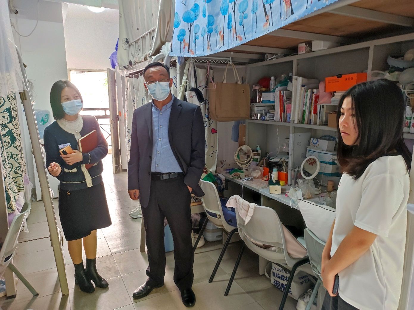 走访过程中,刘冬走进宿舍,与学生亲切交流,关心学生生活上是否存在困难,告知同学们从千里之外的云南来到深圳,要融入深圳,主动作为,投身粤港澳大湾区建设。黄略略询问同学们上学期考试情况,是否存在专业学习困难,要从“假期模式”调整到“学习模式”。段杰鑫着重查看宿舍环境卫生、消防安全等情况,提醒同学们注意用电安全,切勿使用违章电器。