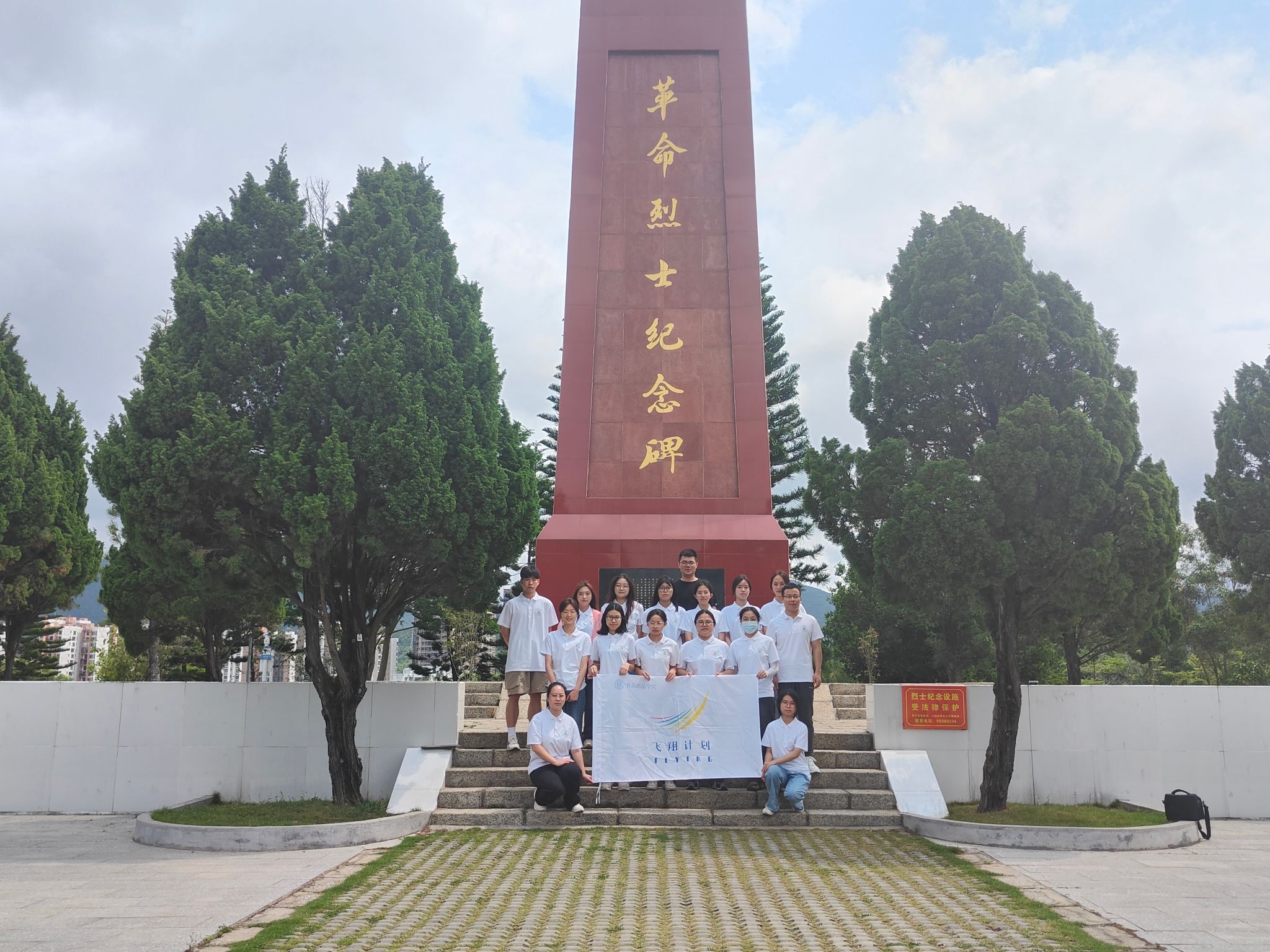 5月6日,为缅怀烈士功绩、弘扬革命精神,食药学院飞翔计划开展红色研学活动前往大鹏革命烈士陵园,由学院刘根柱、杨其要老师带队,15名飞翔计划学员参加。据陵园管理方介绍,为纪念东江纵队和革命战争年代牺牲的革命烈士,中共大鹏镇委和大鹏镇人民政府于1995年在大鹏园岭公园路18号兴建了大鹏革命烈士陵园。同学们绕行革命烈士纪念碑四周,仔细阅读碑座上刻的碑记,碑记上详细诉说大鹏革命烈士可歌可泣的英雄事迹,他们以大无畏的精神,投身于革命事业,用短暂而壮丽的一生在中国革命史上写下了光辉灿烂的一页。通过此次红色教育,同学们感受到革命先辈创业维艰、今日幸福生活来之不易,表示要发愤图强,争取为民族复兴、国家富强做出自己的贡献。(食药学院 刘根柱)