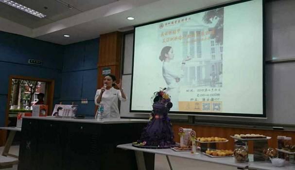 张丹丹首先跟大家分享了她的成长之路暨追梦之路,毕业于金融管理专业的她在银行工作几年后发现她无法放弃做西点师的梦想,在家人不支持的情形下,自己跳槽去新东方做讲师,赚取去法国烹饪名校学习的学费和生活费,自学法语克服语言障碍,学成后回国在酒店西饼房从除冰、收货开始,不怕苦不怕累,一点一点积累经验,随后抓住机遇,买下了自己的第一家饼店,开始了自己的事业。追梦之路很艰难,但是她从没放弃,最终美丽涅槃。张丹丹还为大家准备了精美的产品,其中包括她们的主打甜点马卡龙、各式甜点,造型蛋糕以及她手绘的一些明信片等,这种视觉的直接冲击让学生对自己的专业有了重新的认识,增强了学生的专业认同度。
