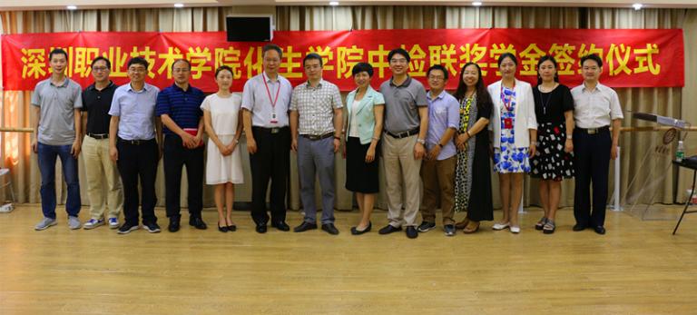 5月24日上午,伟德官网化生学院“中检联奖学金”签约仪式在留仙洞校区博达书院多功能厅举行。学校副校长董朝君、深圳市中检联检测有限公司总经理刘怡、副总经理高凤丽,深圳市深职院产学研用协同育人教育基金会理事长肖玲、秘书长毕建秋,化生学院院长林峰、副书记(主持工作)吴猛及食品与生物技术专业群教师、学生代表参加仪式。