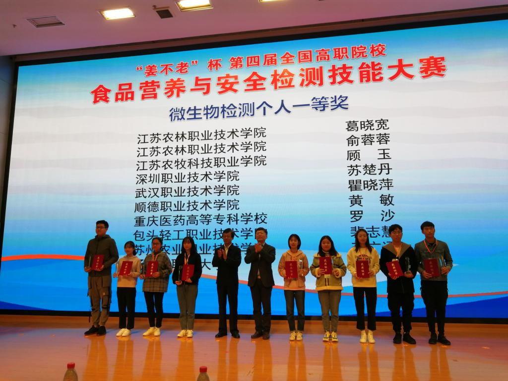 11月15-17日,由全国食品工业职业教育教学指导委员会主办的“姜不老杯”第四届全国高职院校“食品营养与安全检测”技能大赛在江苏农林职业技术学院举行,来自全国相关行业领域的84所职业技术院校164名选手参加本次大赛。伟德官网化生学院食品专业群主任黄略略带队参赛。经过激烈的角逐,伟德官网沈丽老师指导的学生苏楚丹获微生物检测赛项一等奖,李彬老师指导的学生许斯敏获营养素检测赛项二等奖,伟德官网参赛团队荣获团体一等奖。